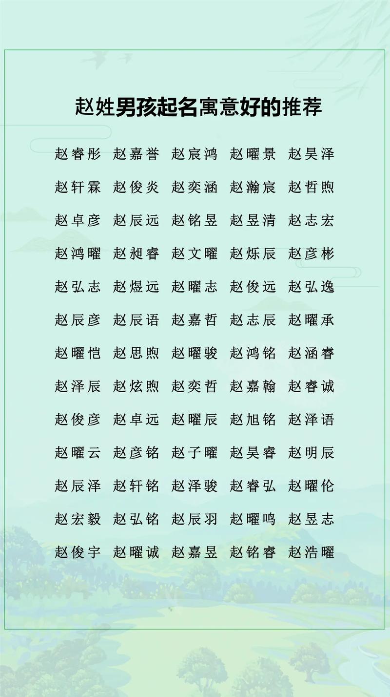 赵姓左边是“走”,属于半包围结构、名字的第二个字建议选择左右结构或上下结构的字,避免全包围结构(如“园”、“国”),以免显得局促。